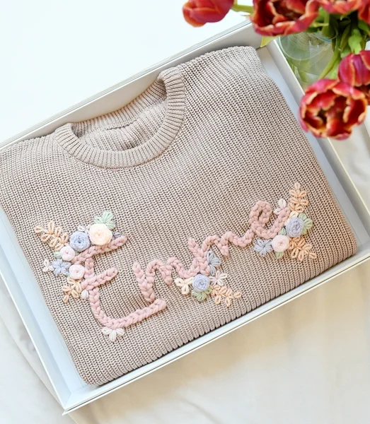 Nime äärde lisanduvad õrnad lillekesed, mis annavad kampsunile pehme ja naiseliku puudutuse.