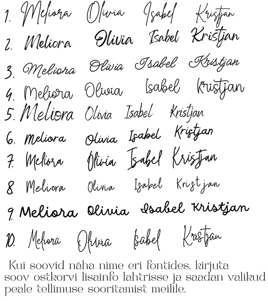 Please write all special requests in the additional information field in the shopping cart and I will try to make them happen! If you would like to discuss your order in more detail before ordering, feel free to write to me on Instagram, Facebook or email and we will find the right design together! I will also be happy to send the fonts with the desired name.