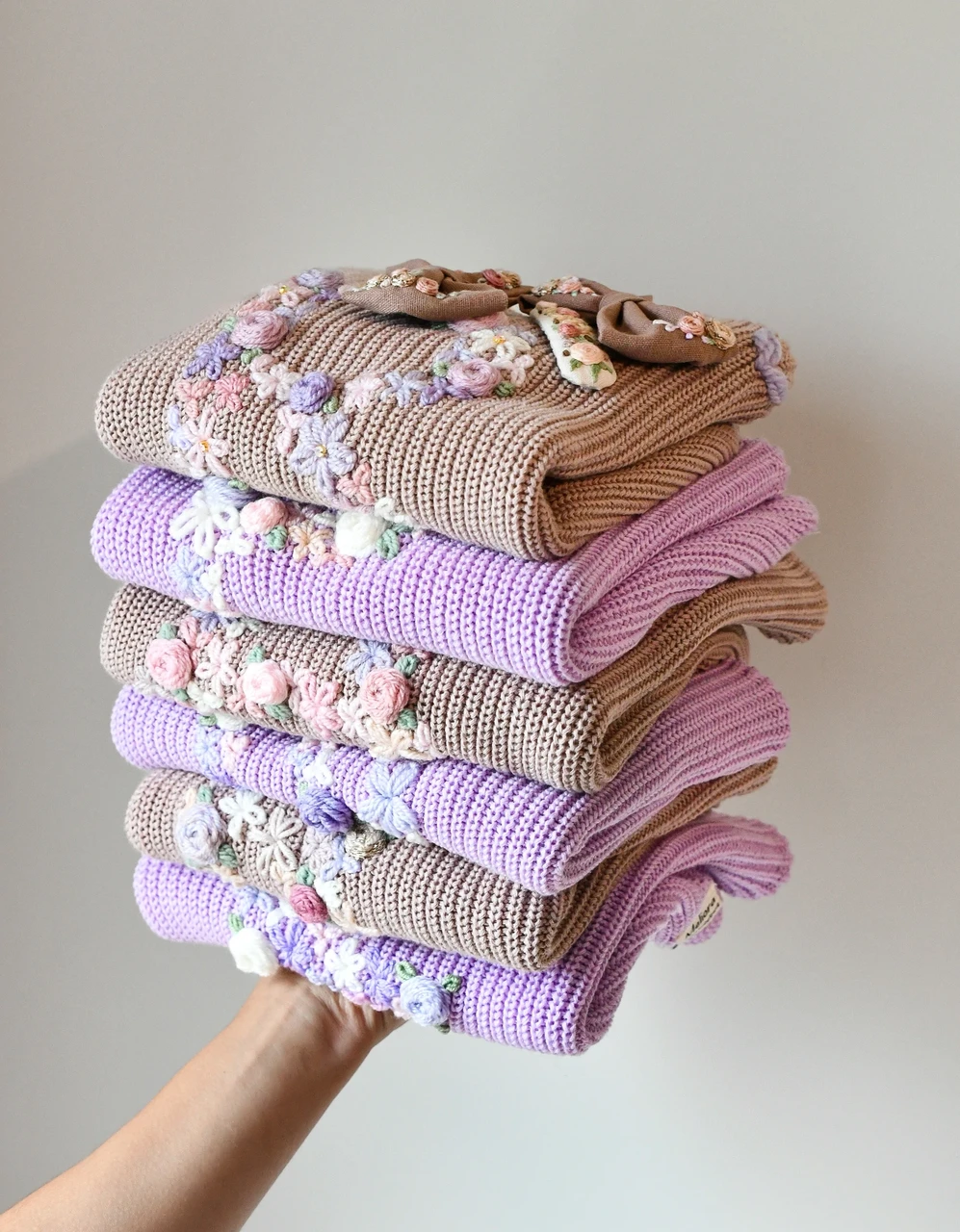 Mütsid on villasegused ja seelikud samuti 100% puuvill. Beebitekid 100% meriinovillased, seega asendamatu igal aastaajal. Tikitud juukseehtete tegemisel kasutan linast kangast.
